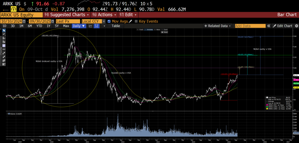 První je příliv levného půjčeného kapitálu do středních a menších společností, na které se Fond zaměřuje, podobný roku 2020 a 2021. Zde dokázali tyto společnosti výrazně rychle růst a překonávat zaběhlá ocenění. Typickým příkladem je inovativní fond Ark Innovation od společnosti Ark Invest známé investorky Cathie Wood, který zastupuje koš těchto inovativních aktiv středních společností. Tento fond v prostředí nízkých úrokových sazeb vzrostl o 383 % v průběhu roku 2020 a začátku 2021. Letos od celního dna připisuje ke konci září již 125 % a prostředí nízkých úrokových sazeb by ho mělo posunout na jeho dřívější maxim, zejména vzhledem k tomu, že inovativní společnosti, které má nakoupené, jsou 3-4 x větší než v roce 2020.