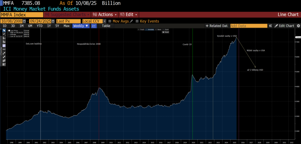 Nyní leží za 4,5 % výnos na peněžním trhu v USA abnormální objem prostředků, 7,4 bilionu USD. Zhruba 70 % drží instituce a 30 % retail. V moment, kdy sazby rychle klesnou, jak se očekává v první polovině roku 2026, tak rychle klesne i objem peněžní zásoby a tyto prostředky dodají palivo akceleraci akciového trhu v prostředí nízkých úrokových sazeb. Rok 2026 by měl být tedy podobný roku 2020 s významným růstem.