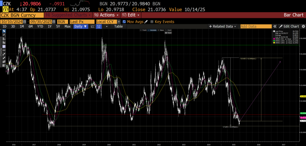 Sazby by se měly dále snižovat ve 4Q ještě 2x a začátkem příštího roku se změní guvernér centrální banky. Nový guvernér bude usilovat o rychlé snižování sazeb. To by mělo přispět k růstu ocenění Fondu ještě o 20 % v průběhu 4Q a dalšímu významnému růstu v roce 2026. Také by se měl rehabilitovat silně pokleslý americký dolar, který od začátku roku propadnul o 18 %. Pro Fond se jedná o odložený zisk, který by se měl propsat v průběhu příštího roku zpět.